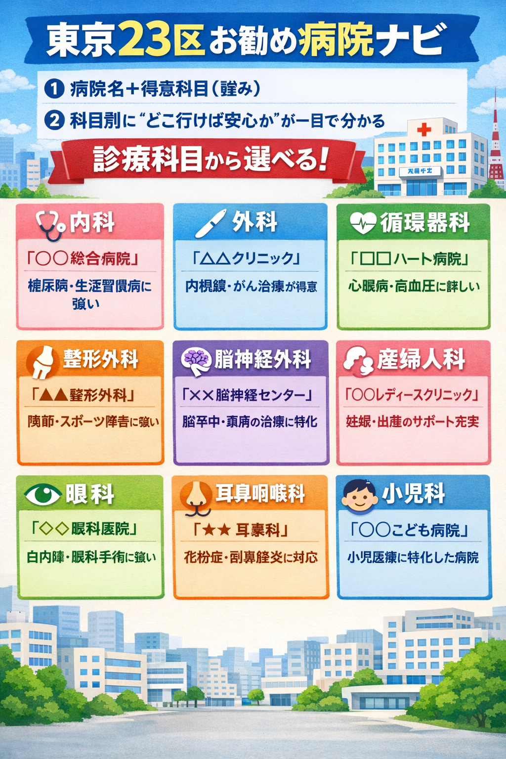 上記のような症状に合わせて、区ごとにおすすめの病院を一覧で紹介。